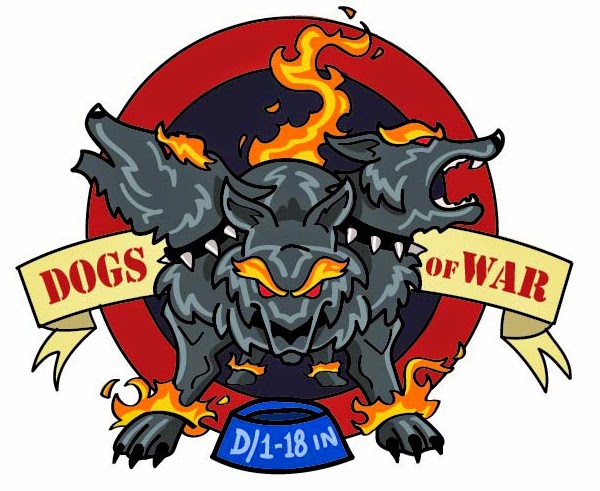 A friend of mine asked me to do a logo design for his job, a little company known as the Unite States Army! Cpt. B. Kossler, of the the U.S. Army is commander of a unit known as "The Dogs of War." Below are the two designs for the patch he commissioned me to work on. The first one I came up with had the dogs' eyebrows burning, but the Captain nixed that idea in favor of good old furry eyebrows! Below I share both renditions! Enjoy!